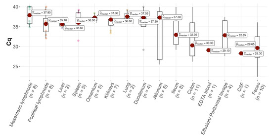 Box-whisker-plot comparing Cq values in tissue, fluid, and fecal samples from the 21 cats positive for feline coronavirus (FCoV) RNA in at least one sample. EDTA = ethylenediamine tetra acetic acid; CSF = cerebrospinal fluid.