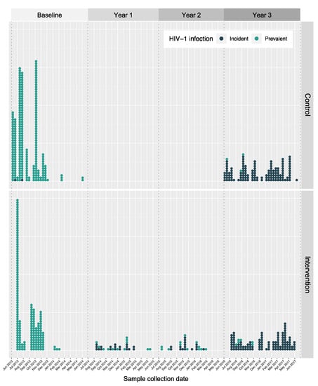 The prevalent and incident sequencing densities (the percentage of HIV-1 positive SEARCH trial participants successfully amplified) are summarised in Table 2, according to geographical region and the SEARCH trial arm. Overall, the sequencing density of incident HIV-1 infections is much higher (above 30% in all cases) than the sequencing density of prevalent HIV-1 infections, highlighting the priority of the SEARCH trial with regard to sequencing incident infections recorded during the trial. The timing of sample collection for sequenced participants, with distinction between the trial arm and HIV-1 infection category, is summarised in Figure 2, showcasing the difference in screening intensity between intervention and control communities.