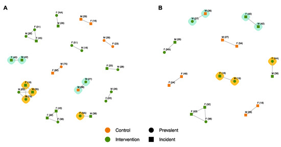 (A) SEARCH sequenced participants in <1.5% pairwise genetic distance (GD) clusters (n = 30 sequences) and (B) participants in SEARCH-incident, phylodynamic clusters (n = 19 sequences). Nodes representing participants from control communities are in orange, intervention communities are in green; circles represent prevalent infections, squares incident infections; nodes are labelled with the gender (M = male, F = female) and age (years, in brackets) for each participant; turquoise-highlighted clusters are inferred inter-community transmissions, gold-highlighted sequences are NNRTI resistant.