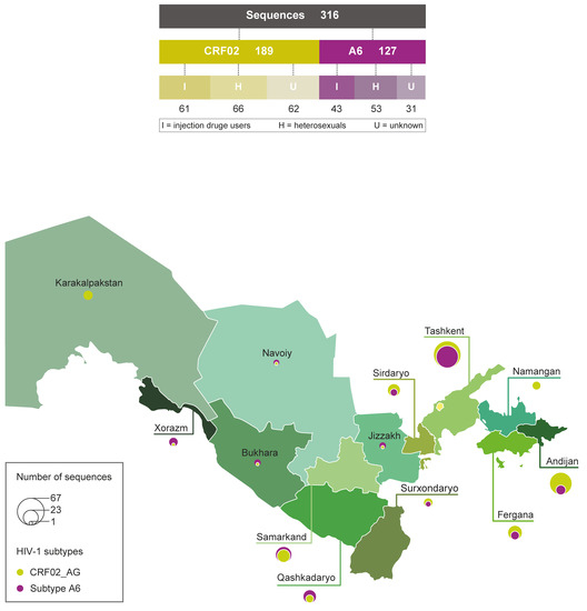 - Kurbanov, F.; Kondo, M.; Tanaka, Y.; Zalalieva, M.; Giasova, G.; Shima, T.; Jounai, N.; Yuldasheva, N.; Ruzibakiev, R.; Mizokami, M.; et al. Human immunodeficiency virus in Uzbekistan: Epidemiological and genetic analyses. AIDS Res. Hum. Retrovir. 2003, 19, 731–738. [Google Scholar] [CrossRef]