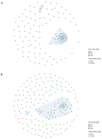Network clustering results for the HIV-infected persons sequences in Uzbekistan generated by MicrobeTrace. The number and size of individual clusters for persons with HIV-1 CRF02_AG (A) and subtype A6 infection (B) are shown. Gender and transmission risk factors have been mapped to node shape and color, respectively, as described in the legend. Each node corresponds to an individual person, and each line represents two persons having a genetic distance 1.5% (d = 0.015). Different clusters are displayed in different polygon using a grey color gradient. Abbreviation: HET, heterosexual contacts; IDU, injection drug users; UNK, unknown.