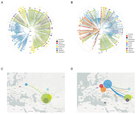 Maximum-likelihood phylogeny and inferred geographical transmission routes of Uzbek HIV-1 sequences with publicly available sequences from FSU and European countries. Shown is the analysis of HIV-1 CRF02_AG (left panel; A,B) and sub-subtypes A6 (right panel; C,D) (A,B). ML-tree shows a time calibrated phylogeny and revealing similarities of most closely related to Uzbekistan global sequences from a BLAST search at GenBank, including sequence from Caucasian and Central Asian republics, and Europe. Branches are colored by country of sampling as indicated in the legends. Branch lengths of ML tree are drawn to scale with the concentric circles indicating calendar years. The trees were rooted through HIV-1 subtype C. (C,D). The migration patterns of the HIV-1 strains in the Uzbekistan and neighboring countries. The image shows the HIV-1 transmissions (migrations) to/from different geographic areas that are colored according to the legends. The circle size is proportional to the number of sequences in corresponding regions. The graphics were generated using the auspice (https://auspice.us, accessed on 20 May 2021).