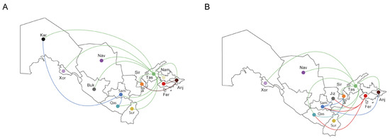 The in-country migration patterns of the HIV-1 strains (Uzbekistan). The image shows the HIV-1 sub-subtype A6 (A) and CRF02_AG (B) transmissions (migrations) to/from different geographic areas that are represented a three-letter code/color code: And, Andijan; Buk, Bukhara; Fer, Fergana; Jiz, Jizzakh; Kar, Karakalpakstan; Xor, Xorazm; Nam, Namangan; Nav, Navoiy; Qas, Qashqadaryo; Sam, Samarkand; Sir, Sirdaryo; Sur, Surxondaryo; Tas, Tashkent.