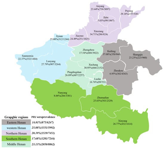 Seroprevalence of pseudorabies virus (PRV) in different geographical regions in the Henan province of China during 2019–2021.