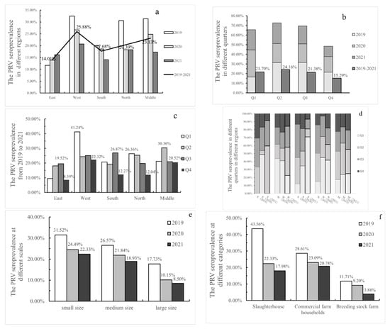 Seroprevalence rate of PRV-gE in the Henan province, China, 2019–2021, from different perspectives. (a) Seroprevalence rate of PRV-gE in different regions. (b) Seroprevalence rate of PRV-gE in different quarters. (c,d) Seroprevalence rate of PRV-gE in different quarters in different regions. (e) The PRV-gE seropositive rate of farms of different scales. (f) The PRV-gE seropositive rate of farms of different categories.