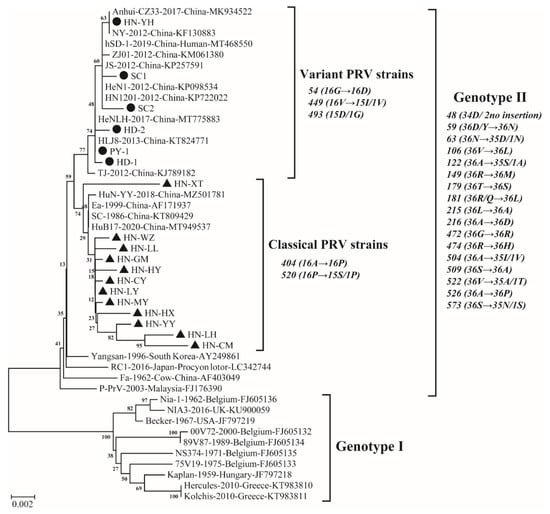 Phylogenetic tree based on the nucleotide sequences of gE gene of 18 PRV isolates determined in this study and 28 reference strains. Neighbor-joining trees were constructed with p-distance model and bootstrapping at 1000 replicates. Black solid circles (●) and black solid triangles (▲) represent variant strains and classical strains in this study, respectively.