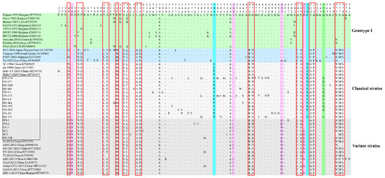 All amino acid mutation sites of gE protein of 18 PRV isolates sequenced in this study and 28 reference strains. All the strains were clustered into two genotypes, and genotype I only contained European–American PRV strains (mint green), while genotype II included Chinese variant strains (cloud gray), Chinese classical strains (pearl river gray) and Asian strains (Maya blue). The PRV isolates acquired in this study are shown in the hollow black rectangle. Compared with genotype I strains, unique amino acids substitutions of genotype II strains are shown in the hollow red rectangles. Amino acid mutations in variant strains are highlighted in lavender violet. The arctic blue areas represent unique amino acids substitutions in classical PRV strains. The screamin’ green area represents unique amino acid substitutions in classical PRV strains from the Henan province.