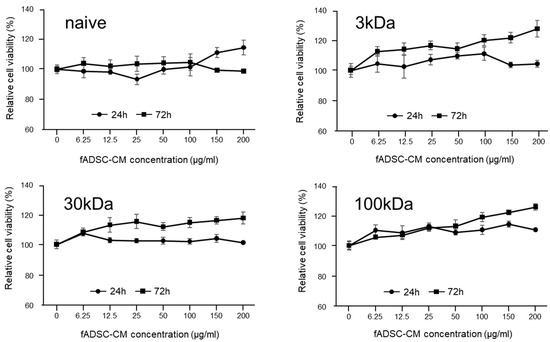In this study, feline AD-MSC secretome was collected as conditioned medium (CM). To prepare the feline AD-MSC CM (fADSC-CM), passage 2 feline AD-MSCs were seeded (3.0 × 104 cells/cm2) individually into DMEM supplemented with 10% FBS and 1% antibiotic–antimycotic solution and incubated overnight. Adherent cells were washed and further incubated in FBS-free DMEM for 36 h, then the medium was centrifuged at 300× g for 5 min and 1200× g for 20 min at 4 °C to remove cells and debris. The naïve CM was concentrated using molecular weight cut-off (MWCO) ultrafiltration with membranes of 3 kDa, 30 kDa, and 100 kDa. The total protein concentrations of naïve and MWCO-concentrated supernatants were measured with a BCA assay kit, then stored at −80 °C until further assay.