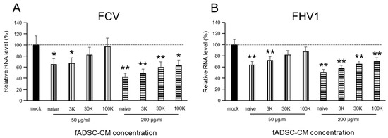 The viral replication of both FCV and FHV1 were suppressed when cells were incubated in 200 µg/mL of naïve and 3 kDa, 30 kDa, and 100 kDa MWCO-treated fADSC-CM (Figure 2). The relative FCV vmRNA levels in the cells treated with 200 µg/mL of naïve and 3 kDa, 30 kDa, and 100 kDa fADSC-CM were 42.1%, 48.3%, 58.4%, and 61.4%, respectively, compared with those in mock CRFK cells. The relative FHV1 vmRNA levels in the cells treated with 200 µg/mL of naïve and 3 kDa, 30 kDa, and 100 kDa fADSC-CM were 50.9%, 57.4%, 64.9%, and 70.1%, respectively, compared with those in the mock CRFK cells. However, when the concentration of fADSC-CM was decreased to 50 µg/mL, only naïve and 3 kDa fADSC-CM significantly suppressed both FCV and FHV1 replication.