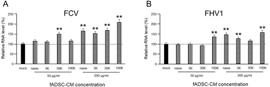 The vmRNA levels after both FCV and FHV1 infection showed that cell treatment in fADSC-CM at concentrations of 50 µg/mL or 200 µg/mL did not prevent viral entry (Figure 3). With 200 µg/mL of the MWCO 100 kDa concentration of fADSC-CM, the highest vmRNA levels for both FCV (207%) and FHV1 (171%) compared with the mock CRFK cells were seen.