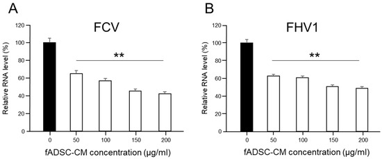 To determine whether the antiviral effect of fADSC-CM on the CRFK cells was dose-dependent, different concentrations of naïve fADSC-CM (50 µg/mL, 100 µg/mL, 150 µg/mL, and 200 µg/mL) were administrated after FCV and FHV1 infection. After incubation for 24 h at 37 °C in 5% CO2, the total RNA was extracted from the cells, and the levels of vmRNA were determined by real-time RT-PCR.