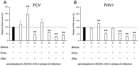 To evaluate whether fADSC-CM would affect the entry of FCV and FHV1 into CRFK cells, cells were incubated overnight in 24-well plates at 37 °C in 5% CO2 in the complete medium. The complete medium was removed, and the monolayer was infected at an MOI of 0.1 with FCV and FHV1 solutions containing different concentrations of fADSC-CM (50 µg/mL and 200 µg/mL) at 37 °C for 1 h. After removing the virus solutions and washing three times with PBS, the cells were incubated in the complete medium for an additional 1 h. After incubation, the total RNA was extracted from the cells to determine the levels of vmRNA by real-time RT-PCR.