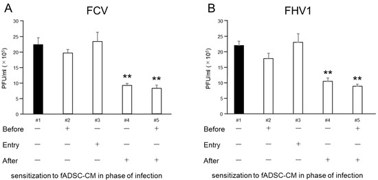 To compare the antiviral activity of fADSC-CM on the CRFK cells challenged with infection, the CRFK cells were exposed to naïve fADSC-CM before infection, at the time of infection, and/or after infection and incubated in 24-well plates or 12 h at 37 °C in the complete medium. For the before the infection group, the monolayer was incubated with 200 µg/mL of naïve fADSC-CM at 37 °C for 12 h, then infected with FCV and FHV1 at an MOI of 0.1 for 1 h. After infection, the CRFK cells were washed three times with PBS and incubated in 2% FCS DMEM for 24 h. For the group representing the duration of the infection, the monolayer was incubated in the complete medium for 12 h, then exposed to FCV and FHV1 solutions at an MOI of 0.1 that included 200 µg/mL of fADSC-CM for 1 h. For the after the viral infection group, the CRFK cells were washed three times with PBS, then incubated in 2% FCS DMEM for 24 h; then the monolayer was incubated with the complete medium for 12 h and the cells infected with FCV and FHV1 at an MOI of 0.1 for 1 h. After infection, the CRFK cells were washed three times in PBS and incubated in 200 µg/mL of naïve fADSC-CM for 24 h. After incubation for 24 h, the total RNA was extracted from the cells, and the levels of vmRNA were determined by real-time RT-PCR. After 24 h incubation of all the groups, cell supernatants were collected for using the plaque assay.
