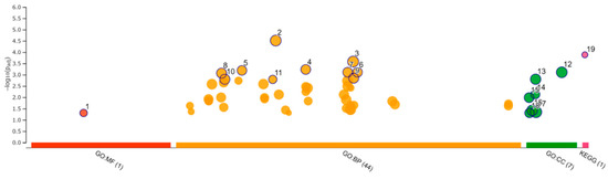 Functional enrichment analysis of 181 upregulated differentially expressed genes by g:Profiler. Results of enrichment analysis presented in the form of a Manhattan plot, where the x-axis shows the functional terms grouped by the color-coded of source database, while the y-axis shows the enrichment adjusted p-values in negative decimal logarithm scale. Dots in the graph indicate all enriched terms meeting the significance criterion of p < 0.05.