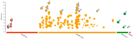 Functional enrichment analysis was performed using 181 selected upregulated genes and 229 downregulated genes. Analysis of the upregulated genes identified one GO molecular function (MF), 44 GO biological process (BP), 7 GO cellular component (CC), and 1 KEGG pathway. The analysis of downregulated genes identified 6 GO MF, 150 GO BP, and 4 GO CC. The categories of all GO MF, GO CC, and KEGG pathways and the top 10 GO BP are shown in Figure 8 and Figure 9 and Table 4 and Table 5. All results, including annotated GO terms, are listed in Supplementary Tables S3 and S4.