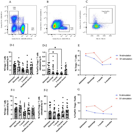 Treg responses in SARS-CoV-2-infected patients. (A–C) are gating strategies for selecting regulatory T-cell population. (A) CD4+ area was gated to further identify Treg cells. (B) CD4+ T cells were identified by CD25+CD127low to be a Treg population. (C) Tregs were added by transcriptional factor FoxP3. (D) Results for stimulation by N peptide of SARS-CoV-2. (D-1) Percentage of Tregs in T-cell population. (D-2) Percentage of FoxP3+Tregs in T-cell population. (E) Percentage of Tregs in T-cell population in the form of kinetic change. (F) Results of stimulation by S1 peptide of SARS-CoV-2. (F-1) Percentage of Tregs in T-cell population. (F-2) Percentage of FoxP3+ Tregs in T-cell population. (G) Percentage of FoxP3+Tregs in T-cell population in the form of kinetic change. (D-1,D-2,F-1,F-2) The results are presented as median with 95% confidence interval (CI). Statistical significance of differences between groups was determined using the Kruskal–Wallis test followed by Dunn’s multiple-comparison test, * p ≤ 0.05.