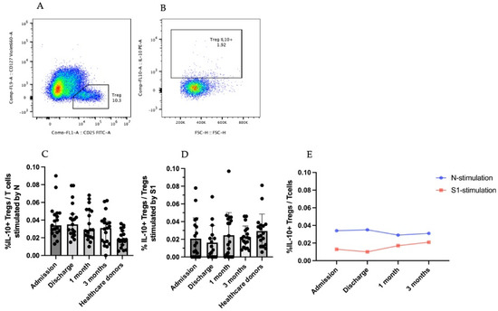 IL-10+Treg responses in SARS-CoV-2-infected patients. (A,B) are gating strategies for selecting IL-10-secreting regulatory T-cell populations. (C) Percentage of IL-10+Treg in T-cell population stimulated by SARS-CoV-2 N peptide. (D) Percentage of IL-10+Treg in T-cell population stimulated by SARS-CoV-2 S1 peptide. (E) Percentage IL-10+Tregs in T-cell population in the form of kinetic change. The results are presented as median with 95% CI. Statistical significance of differences between groups was determined using the Kruskal–Wallis test followed by Dunn’s multiple-comparison test. No significant differences were observed.