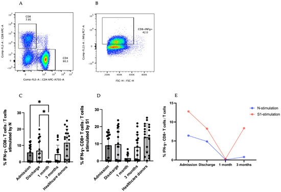 IFN-γ + T-cell responses in COVID-19 patients. (A,B) are the steps of the gating strategy of IFNγ+CD8+ T cells (B). (C,D) are the percentage of IFN-γ +CD8+ T cells in T-cell population stimulated by SARS-CoV-2 N and S1 peptides. (E) Percentage of IFN-γ+ CD8+ T cells in T-cell population in the form of kinetic change. The results are presented as median with 95% CI. Statistical significance of differences between groups was determined using the Kruskal–Wallis test followed by Dunn’s multiple-comparison test, * p ≤ 0.05.