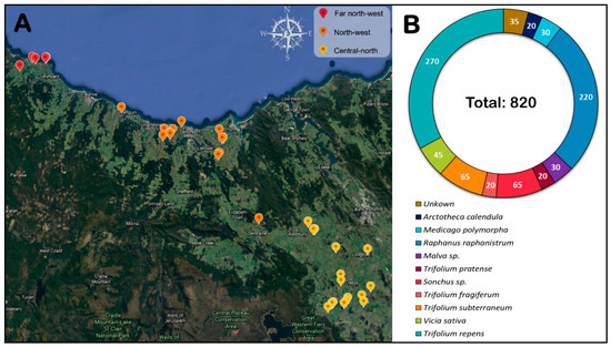 (A) Map of the three different pea crop sampling regions (far northwest, northwest, and central north) in Tasmania. (B) Details of weeds and pasture species samples collected from all sites prior to pea crop sowing.