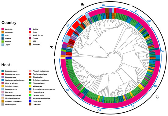 The phylogenetic analysis tree separated all the isolates into three major clades, A, B, and C (excluding the outgroup). Clade A included six already-reported TuYV isolates from different countries (four from Serbia and one each from Greece and Poland). Clade B includes all 19 BrYV (10 from China, 8 from Japan, and 1 from Korea) isolates along with 5 Tasmanian isolates from this study and 19 previously reported isolates (12 from Australia, 3 from China, and 2 from Serbia) (Figure 2). A total of 7 isolates out of these 12 Australian isolates were reported from Tasmania previously [3]. Clade B could be further subdivided into two clades (B1 and B2), with 16 of 19 BrYV worldwide isolates residing in B1 with three previously reported TuYV isolates. Five Tasmanian isolates were present in clade B2 with the three previously reported BrYV and 16 TuYV isolates. Clade C included 111 TuYV isolates in total, which could be further subdivided into seven sub-clades C1, C2, C3, C4, C5, C6 and C7. Clade C1 included five Tasmanian isolates from this study and a previously reported Australian isolate. Another five Tasmanian isolates (this study) clustered with three previously reported isolates from Australia in clade C2. Clade C3 includes 9 Tasmanian isolates, along with 12 Australian, 2 Iranian and 2 Greek isolate. A further ten Tasmanian isolates from this study clustered with another one previously reported isolate from Australia in clade C4. Clade C5 included 14 Tasmanian (this study) and 7 previously reported Australian isolates. Another nine Tasmanian isolates were residing in sub-clade C6. Finally, all remaining 17 Tasmanian isolates were grouped into sub-clade C7 along with 11 Australian and one each from Greek and French isolate (Figure 2).