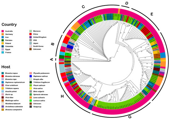 Further analysis showed that the tree separated all the isolates into eight major clades (A to H) (excluding the outgroup). Clade A included only one Tasmanian isolate (92P), whereas seven TuYV (two each from Australia, Pakistan, and France and one from China) isolates clustered together with six BrYV (four from China and two from Japan) in clade B. Clade C contained 19 Tasmanian (this study), 8 Australian, 6 German, and 1 isolate from Poland, and 1 South Korean BrYV isolate. A total of 4 Tasmanian isolates shared clade E with 16 Australian isolates. Clade F contained 10 Tasmanian isolates, sharing this clade with 11 previously reported isolates from Australia, followed by nine from Germany, three from Iran and each isolate from Egypt, Morocco, Poland, and the UK. However, two isolates from this clade have missing information about their origin and host. Thirty Tasmanian isolates clustered with three already reported Australian TuYV isolates in clade G. Clade H included 14 Tasmanian isolates. Finally, all remaining 10 Tasmanian isolates clustered with 11 Australian and 2 Colombian isolates (Figure 3). As has been previously shown, P3 sequence analyses did not discriminate between TuYV and BrYV isolates.