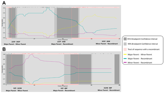 The analyses also revealed the recombination breakpoints i.e., putative recombination hot spots within the P0 gene (in five sequences), at positions 32–390 (without gaps) in the alignment (corresponding to nucleotides 34–409 of the P0 gene) (Figure 4A). The recombination hotspots within the P3 gene were detected (in 34 sequences) at positions 23–310 (without gaps) in the alignment (corresponding to nucleotide 24–312 within the gene) (Figure 4B).
