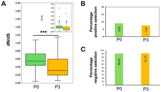 (A) Selection pressure was estimated by the calculation of non-synonymous to synonymous substitution ratios (dN/dS). Box plots correspond to dN/dS ratio for the TuYV-encoded P0 gene and P3 gene. The median values are represented by the horizontal lines inside the box, while inset shows the data with outliers indicated by small circles. Asterisks denote significance: *** p < 0.001. (B) Percentage of sites evolving under positive selection pressure in TuYV-encoded P0 gene and P3 gene. (C) Percentage of negatively selected sites among TuYV-encoded P0 gene and P3 gene.