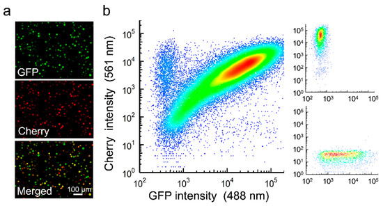 Coinfection of Sf21 cells with GFP- and Cherry-expressing AcMNPV. Cells were inoculated at an MOI of 5 PFU/cell and analyzed at 40 hpi. (a). Fluorescence microscopy. (b). Flow cytometry. Small panels on the right show monoinfected controls.