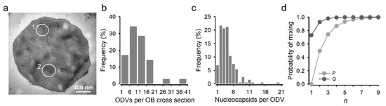 ODV and nucleocapsid content of AcMNPV OBs. (a). Transmission electron micrography of an OB obtained from Sf21 cells coinfected with the GFP- and Cherry-expressing variants at an MOI of 5 PFU/cell and harvested at 6 dpi. ODVs appear in transverse (1) and longitudinal (2) sections. (b). Distribution of the observed number of ODVs per OB cross section. (c). Distribution of the number of nucleocapsids per ODV. Only transverse sections were used for determining this distribution. (d). Probability that an ODV (P, light grey) or OB (Q, dark grey) contains a mixture of nucleocapsids from both types (GFP and Cherry) assuming free assortment of the two variants in coinfected cells. P depends on the number of nucleocapsids per ODV (shown as n in the x-axis). To calculate Q, we integrated P over the observed distribution of the number of nucleocapsids per ODV, shown in c. Q further depends on the number of ODVs per OB (also represented as n in the x-axis). See methods for calculation details.