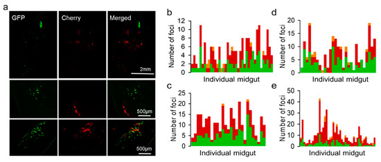Microscopic examination of midgut infection foci at 72 hpi. (a). Representative images of full midguts (top) and individual foci showing segregated (middle) or co-localizing (bottom) GFP and Cherry reporters. (b). Analysis of larvae inoculated with OBs prepared from coinfected Sf21 cells (F1). Each bar represents the midgut of an individual larva and the stacked colors indicate the numbers of GFP-positive (green), Cherry-positive (red), and doubly fluorescent (orange) foci. (c). Analysis of larvae inoculated with F2 viruses (i.e., OBs released by F1). (d). Larvae inoculated with OBs prepared from Sf21 cells coinfected with a polyhedrin-defective GFP virus and a complete Cherry virus (F1). (e). Analysis of larvae inoculated with F2 viruses derived from the F1 polyhedrin-defective GFP virus and complete Cherry virus infection.