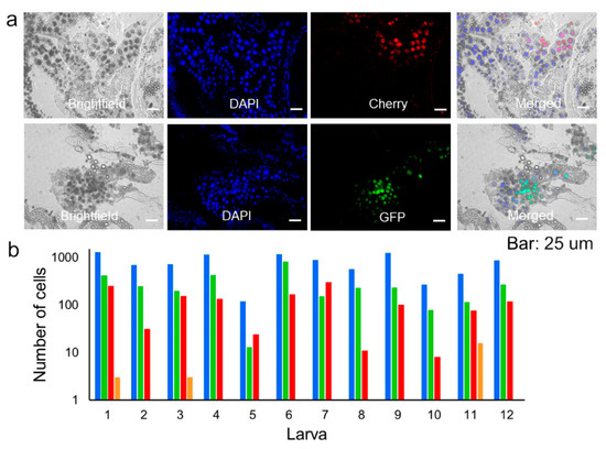 Larvae were encased in cryomolds and coated with embedding medium for freezing (Tissue-Plus O.C.T). Immediately after, the molds were immersed in liquid nitrogen for a few seconds and then kept at −80 °C. Longitudinal 25 μm sections of 12 entire larvae were prepared using a cryostat (Leica CM1950). Slides with tissue sections were stored at −20 °C until use. Tissue samples were stained with DAPI (4′,6-diamidino-2-phenylindole), incubated for 10 min, and washed twice with PBS. The slides were mounted with FluorSave reagent under a coverslip and observed with a fluorescence microscope equipped with DAPI, GFP, and Cherry filters.