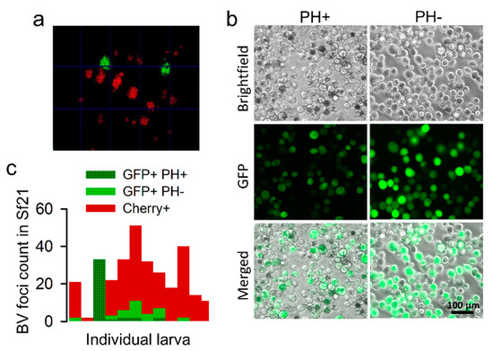 The hemolymph of 14 infected larvae from the F2 generation was collected in 10 µL of ice-cold PBS (1X), filtered through a 0.45 μm membrane filter, and used directly for foci assays in Sf21 cells. Well-isolated foci were analyzed at 96 hpi under a fluorescent microscope equipped with GFP and Cherry filters and incubated an additional 48 h to check the production of polyhedrin in the phase contrast channel.