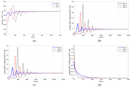 In this subsection, we study the impact of HIV-1-specific antibodies on the HIV-1/HTLV-I co-infection dynamics. We note that the stability of the infection-free steady state depends on the parameters and . These parameters do not depend on the proliferation of the HIV-1-specific antibodies . Therefore, HIV-1-specific antibodies do not play the role of clearing the HIV-1 infection, but they have an important role in controlling and suppressing HTLV-I infection. To observe the effect of HIV-1-specific antibodies on the solutions of the model, we fixed the parameters and varied the parameter. We chose the following initial conditions: