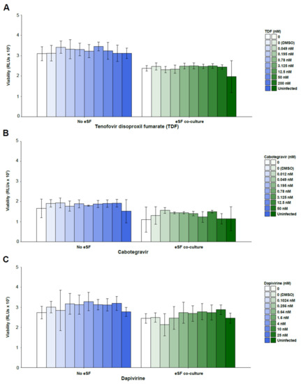 The tested concentrations of the PrEP drugs tenofovir disoproxil fumarate (TDF), cabotegravir, and dapivirine do not diminish PBMC viability in the absence or presence of eSFs. PHA/IL2-activated PBMCs were incubated with or without a HIV luciferase reporter virus (CXCR4-tropic NL4-3.Luc) and the indicated concentrations of (A) TDF, (B) cabotegravir, or (C) dapivirine in the absence or presence of eSFs. PBMC viability was monitored 3 days later by the CellTiter-Glo® Luminescent Cell Viability Assay. Mean luminescence ± SD derived from sextuplet experimental replicates are shown (RLU/s, relative light units per second). The limit of detection for luminescence ranged from 1 × 102 to 1 × 1010 RLUs. Non-significant (p < 0.05) in a group-wise comparison (one-way analysis of variance with a Tukey post-test).