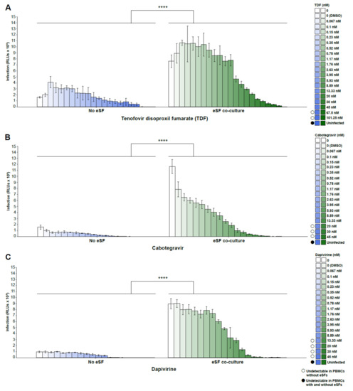 eSFs diminish the in vitro efficacy of tenofovir disoproxil fumarate (TDF), cabotegravir, and dapivirine in PBMCs from multiple donors. Infection rates of PBMCs (N = 4) exposed to increasing concentrations of (A) TDF, (B) cabotegravir, or (C) dapivirine are shown. PHA/IL2-activated PBMCs treated with the indicated drug were mock-treated or inoculated with NL4-3.Luc, in the absence or presence of eSF, and harvested 3 days later. Mean luciferase activities ± SD are shown. The limit of detection for luminescence ranged from 1 × 102 to 1 × 1010 RLUs. Open circles indicate drug concentrations where infection was undetectable in PBMCs without eSFs. Filled circles indicate drug concentrations where infection was undetectable in PBMCs with or without eSFs. **** p < 0001 relative to no coculture in a group-wise comparison (two-way analysis of variance with a Tukey post-test).