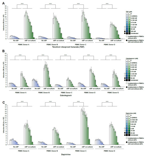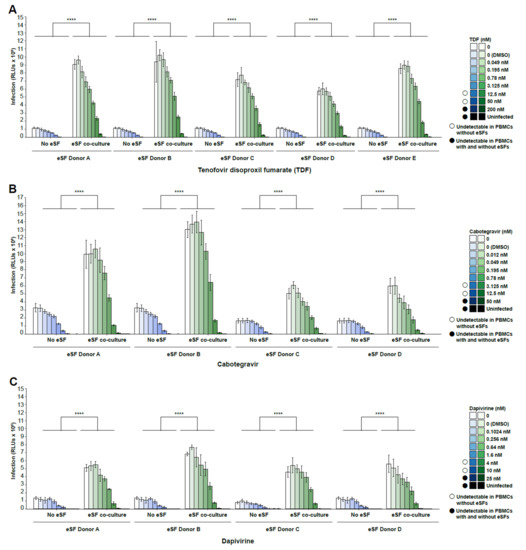 eSFs from multiple donors all diminish the in vitro efficacy of tenofovir disoproxil fumarate (TDF), cabotegravir, and dapivirine. Infection rates of PBMCs from a single donor exposed to (A) TDF, (B) cabotegravir, or (C) dapivirine in the presence or absence of eSFs from multiple donors. PHA/IL2-activated PBMCs treated with the indicated drug were mock-inoculated or inoculated with CXCR4-tropic NL4-3.Luc, in the absence or presence of eSFs (N = 4–5), and harvested 3 days later. Mean luciferase activities ± SD are shown. The limit of detection for luminescence ranged from 1 × 102 to 1 × 1010 RLUs. Open circles indicate drug concentrations where infection was undetectable in PBMCs without eSFs. Filled circles indicate drug concentrations where infection was undetectable in PBMCs with or without eSFs. **** p < 0001 relative to no coculture in a group-wise comparison (two-way analysis of variance with a Tukey post-test).