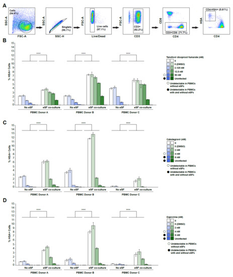 The experiments reported so far used an X4-tropic luciferase HIV reporter virus, which allows for high-throughput analysis of a large number of PrEP drug dilutions. We previously found that eSF-mediated enhancement of HIV infection occurs with both X4-tropic HIV and R5-tropic HIV viruses, including transmitted/founder (T/F) viruses [31]. As mucosal transmission of HIV is mediated by R5-tropic T/F HIV, we next investigated to what extent eSFs affect the antiviral activity of PrEP drugs against the R5-tropic NL-HSA.6ATRi-C.109FPB4.ecto reporter virus (HIV-F4.HSA), which encodes the R5-tropic T/F subtype C envelope 109FPB4 [36]. PHA-activated PBMCs (N = 3 donors) were incubated for 30 min in the absence or presence of eSFs, and in the presence of each of the tested PrEP drugs. Cultures were then infected with HIV-F4.HSA, and CD4+ T cell infection rates were assessed 3 d later by flow cytometry. A sequential gating strategy was used to identify live, CD4+ T cells as viable, singlet, CD3+CD8- cells (Figure 5A), so as to capture infected (HSA+) T cells that had downregulated surface CD4 after HIV entry [36,38,39]. In both the absence and presence of eSFs, HIV infection was inhibited in a dose-dependent manner by all three drugs (Figure 5B–D). However, the percentages of productively-infected CD4+ T cells was always higher in the presence of eSF, across all tested PBMC donors. These data suggest that eSFs reduce the efficacy of PrEP drugs against both X4-tropic and R5-tropic HIV viruses.