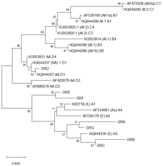 In order to identify nucleotide polymorphisms and amino acid substitutions into the E6 ORF, multiple sequence alignments were performed with the MUSCLE algorithm, in MEGA X software [21]. Analyses for phylogenetic inference were conducted using Neighbor-Joining (NJ) method and trees were constructed using Kimura two-parameter correction methods of MEGA X [22]. To assess the confidence of branching patterns of NJ trees, 1000 bootstrap replicates were performed. In order to perform the sequence analysis and identify the different variants out of the 40 sequences obtained, the program Dambe [23] was used. For the phylogenetic analysis, the reference sequence of HPV16 available at the HPV16 Sequence Database (PaVE) [4] was assessed. Additionally, representative sequences of HPV16 variant lineages and sub-lineages identified to date were used for the phylogenetic analysis, including A1–3 (traditionally classified as European), A4 (Asian), B1–4 (African-1), C1–4 (African-2), D1 (North American), D2 and D3 (Asian-American), and D4 [17,24].
