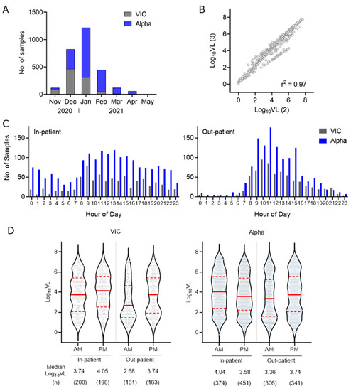 Viral RNA was measured using the Thermo Fisher TaqPath COVID-19 RT-PCR Kit that measures ORF1ab, Spike (S) and Nucleocapsid (N) gene transcripts. As an internal control for the quality of RNA isolation clinical samples were supplemented with MS2 phage RNA prior to extraction. S gene amplification will fail when the infecting variant has genetic mutations or deletions in S, and these samples are defined as S Gene Target Failures (SGTF). Sequencing of viruses showed that the Victoria (VIC) strain was circulating at this time and the SGTF samples represented infection with the Alpha variant (Δ69/70 Spike) [13]. Viral loads (VLs) were estimated from the Ct values using standard curves for each amplicon, as previously reported [12,13]. The interval between sample request and laboratory receipt times allowed us to assess the effect of transport or storage delays on the VL estimates. The VL in samples with intervals of 0–3 or 3–6 h showed a median Log10 VL of 4.2 and 3.9, respectively; however, samples with an interval >6 h had a reduced Log10 VL of 3.7. To reduce variance in VL and to increase confidence in sample time for statistical evaluation, we selected samples with a <6 h interval and used the sample request time for all analysis.