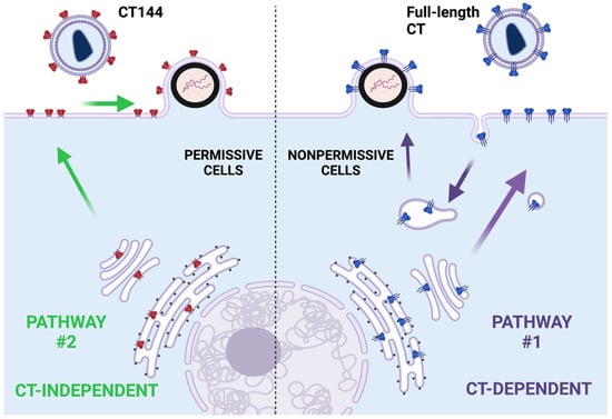 Schematic diagram outlining the existence of different pathways for Env available in nonpermissive vs. permissive cells. Nonpermissive cells exhibit a dominant CT-dependent pathway for incorporation of Env, while permissive cells allow either full-length CT or CT144 (truncated CT) Env to be incorporated. The CT-independent pathway is depicted as passive incorporation at the PM. The CT-independent pathway is lacking or blocked in nonpermissive cells.