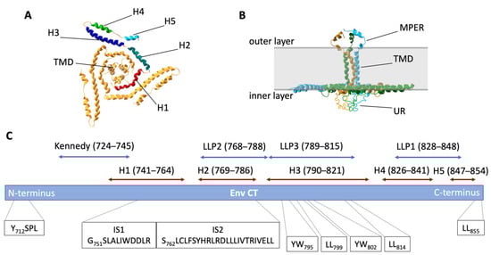 A more recent structural view was obtained for the CT fused with the transmembrane domain of gp41 (TMD), which enabled the probing of the CT conformation and quaternary arrangement in the context of a trimer. An NMR model for this construct in DMPC–DHPC (dimyristoylphosphatidylcholine/dihexanoylphosphatiylcholine) bicelles revealed that each protomer of the CT trimer winds around TMD []. Within each protomer, the structured regions are arranged in five helical segments (H1–5). H1 helices (amino acids (aa) 741–764, preceding LLP2) directly interact with the TMD and form a trimeric “inner ring”, while H2 helices (aa 769–786 of LLP2) fold around TMD, creating an outer ring [,]. The two rings are placed in the polar headgroup region of the lipid bilayer, forming a “baseplate”. Importantly, the H1–H2 segment of the CT spontaneously trimerizes in the presence of TMD, while in the absence of TMD H1–H2 is monomeric []. This work emphasizes the central role of TMD in maintaining gp41 trimer conformation. The H3 (residues 790–821 of LLP3) and H4 (aa 826–841 of LLP1) helices also reside in the headgroup region, and are arranged in a hairpin-like manner around the baseplate. At the C-terminus, aa 847–854 of LLP1 form the last short helix (H5). The overall structural organization and stabilization of interhelical interactions within the CT is due to several hydrophobic and polar clusters, rather than selected individual amino acid residues []. This structure, along with the functional regions and motifs to be discussed, is depicted in Figure 3A–C. Note that the helices forming the baseplate structure align with the inner layer of the PM, while the unstructured region is depicted as protruding beneath the lipid bilayer of the cell or virion.
