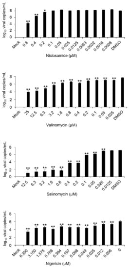 - Wu, C.J.; Jan, J.T.; Chen, C.M.; Hsieh, H.P.; Hwang, D.R.; Liu, H.W.; Liu, C.Y.; Huang, H.W.; Chen, S.C.; Hong, C.F.; et al. Inhibition of severe acute respiratory syndrome coronavirus replication by niclosamide. Antimicrob. Agents Chemother. 2004, 48, 2693–2696. [Google Scholar] [CrossRef] [Green Version]