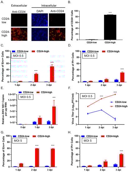 Ectopic expression of CD24 in SK-N-AS cells enhances low MOI spread of ZIKV infection. (A,B) CD24-low and -high cells were analyzed by 4; 6-Diamidino-2-pherylindole (DAPI) staining (blue) or immunostaining with anti-CD24 antibody (red) (A) or by flow cytometry (B) for CD24 expression. Data are a representation of two separate experiments. (C–F) CD24-low and -high cells were infected with ZIKV at a low MOI of 0.5. Flow cytometry was performed at indicated time points to determine the percentage of infected (Env+) cells (C) or non-viable (PI+) cells (D). Total cellular RNA was isolated from infected CD24-low and -high cells at indicated time points, and gene levels of NS1 were determined via qRT-PCR. Data are expressed as Relative ZIKV NS1 copies per µg of analyzed RNA (E). Media were harvested at indicated time points from the infected cell cultures and analyzed by plaque assays to determine levels of infectious virus. Viral titers were expressed as PFU/mL on a logarithmic scale and normalized to 106 infected cells (F–H). CD24-low and -high cells were infected at a high MOI of 5, and the percentage of Env+ (G) and PI+ (H) cells were determined at the indicated days post-infection (dpi). All figures’ values are the mean of three samples, with error bars representing standard deviation. *** indicates p-value < 0.001.