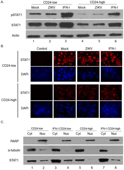 CD24-low and CD24-high cells differ in total levels, phosphorylation, and cellular distribution of STAT1. (A,B) Cultures of CD24-low and -high cells were either mock-infected, ZIKV-infected at MOI 5, or treated with 10 u/mL of IFN-I for 18 h. Levels of STAT1, pSTAT1, and actin proteins were analyzed by Western blotting (A). Alternatively, STAT1 levels were also determined by immunostaining (B) with an antibody to STAT1 (red) and nuclear DAPI (blue). Exposure times for immunofluorescence and DAPI were the same between mock- and ZIKV-infected CD24-low and CD24-high cells. Images are shown at 20× magnification. (C) CD24-low and -high cells were either left untreated or treated with 10 units/mL of IFN-I for 18 h. Cell lysates were fractionated into cytoplasmic (Cyt) and nuclear (Nuc) fractions before analysis by Western blotting for PARP as a nuclear marker, α-tubulin for a cytoplasmic marker, and total STAT1.