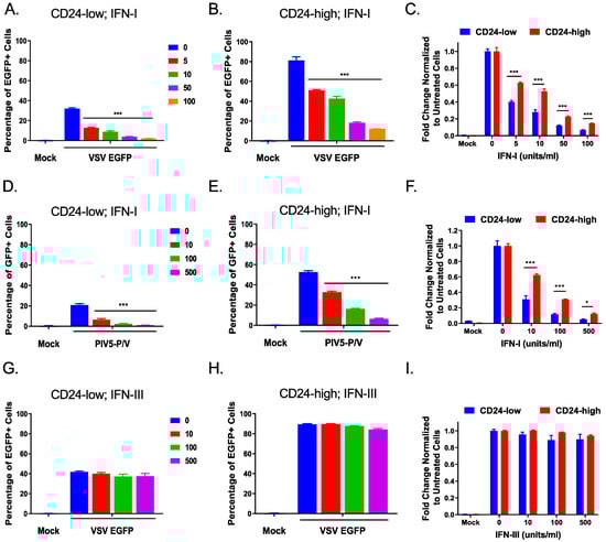 CD24-low and CD24-high cells differ in IFN-I-mediated sensitivity to virus infection. CD24-low (A,D,G) and CD24-high (B,E,H) cells were treated with the indicated concentrations of IFN-I (A–F) or IFN-III (G–I) for 14–17 h or 24 h, respectively. Treated cells were then either mock-infected or infected with VSV-EGFP at an MOI of 5 for 7 h (panels (A–C,G–I)), and flow cytometry was performed to determine the percentage of EGFP+ cells. Alternatively, IFN-I treated cells were infected at an MOI of 5 with the PIV5-P/V virus. Flow cytometry was performed ~24 h after infection (D–F) to determine the percentage of GFP+ cells. To compare the relative permissivity of IFN-treated CD24-low and -high cells to VSV-EGFP or PIV5-P/V, data are expressed as fold changes normalized to respective untreated cell populations (panels (C,F,I)). Values are the mean of three samples, with error bars representing standard deviation. * and *** indicate p-values of <0.033 and <0.001, respectively.