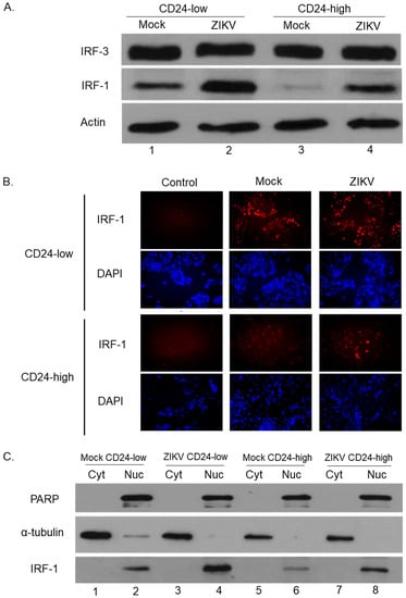 When activated, IRF-1 translocates into the nucleus to facilitate antiviral responses [22,23]. To determine whether CD24 expression affects cellular localization of IRF-1, cell lysates of mock- and ZIKV-infected CD24-low and -high cells were fractionated into their respective Cyt and Nuc fractions and analyzed by Western blotting for PARP (Nuc control), α-tubulin (Cyt control), and IRF-1. As shown in Figure 5C, PARP protein localized to the Nuc fractions (lanes 2, 4, 6, and 8), while α-tubulin localized mainly to the Cyt fractions (lanes 1, 3, 5, and 7). Basal and ZIKV infection-induced levels of IRF-1 were similarly fractionated in the case of CD24-low and -high cells, with the only apparent difference being the overall higher level of IRF-1 expression in CD24-low cells (Figure 5C, compare lanes 2 and 6).