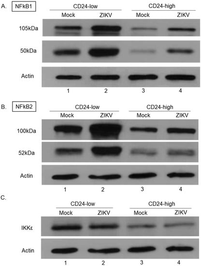 The expression of NFκB1, NFκB2, and IKKε differs between CD24-low and CD24-high cells. Cells were either mock- or ZIKV-infected at MOI of 5 for 18 h. Total levels of (A) NFκB1 (p105/p50), (B) NFκB2 (p100/p52), (C) IKKε, and actin were analyzed via Western blotting.