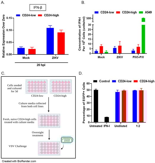 To evaluate the effect of CD24 expression on IFN-I induction, CD24-low and -high cells were either mock-infected or ZIKV-infected at an MOI of 5. At 20 hpi, RNA was extracted, and qRT-PCR was performed with primers specific for IFN-β. As shown in Figure 7A, there was no significant difference in basal levels (relative expression over zero) of IFN-β gene expression in mock-infected CD24-low and -high cells at 20 hpi.