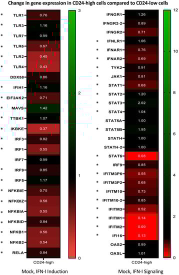 Global transcriptomic analysis reveals downregulation of key IFN-I pathway genes in CD24-high versus CD24-low cells. In the absence of virus, cultures of CD24-low and -high cells were mock-infected, and total cellular RNA was isolated and analyzed by RNA sequencing as described in the Materials and Methods. Using CD24-low cells as a baseline, heat maps were generated to visualize fold changes in IFN induction and IFN-signaling pathway genes that were either upregulated (green, values > 1) or downregulated (red, values < 1) in mock-infected CD24-high cells. Genes labelled with * indicate a p-value less than 0.05. Values are the mean of three samples.