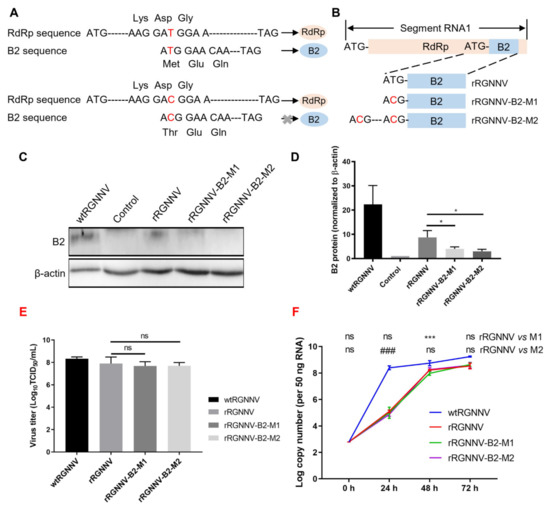 Construction of rRGNNV-B2-M1 and rRGNNV-B2-M2 viruses. (A,B) Schematic representation of the construction of pRGNNV-T7-RNA1-B2-M1-CMV-eGFP and pRGNNV-T7-RNA1-B2-M2-CMV-eGFP. (C,D) B2 expression detected by Western blotting. B7GG cells were transfected with plasmid pRGNNV-T7-RNA1-CMV-eGFP, pRGNNV-T7-RNA1-B2-M1-CMV-eGFP or pRGNNV-T7-RNA1-B2-M2-CMV-eGFP for 36 h. SSN-1 cells infected with wtRGNNV directly were used as positive control. Blank cells were used as negative control. B2 was detected by Western blotting, β-actin was used as the internal control. (E) The virus titer of wtRGNNV, rRGNNV, rRGNNV-B2-M1, and rRGNNV-B2-M2 was measured using TCID50. Both supernatants and SSN-1 cells were collected at 72 hpi for viral titration. (F) Viral replication kinetics of recombinant RGNNV. SSN-1 cells were infected with 5 MOI of wtRGNNV, rRGNNV, rRGNNV-B2-M1, and rRGNNV-B2-M2, respectively. Cells were collected at 0, 24, 48 and 72 hpi for viral Cp RNA detection by RT-qPCR. Data shown in (D–F) are mean ± SD of three independent experiments. * p < 0.05; *** p < 0.001; ### p < 0.001; ns, not significant; both by Student t-test. All experiments were performed in triplicate.